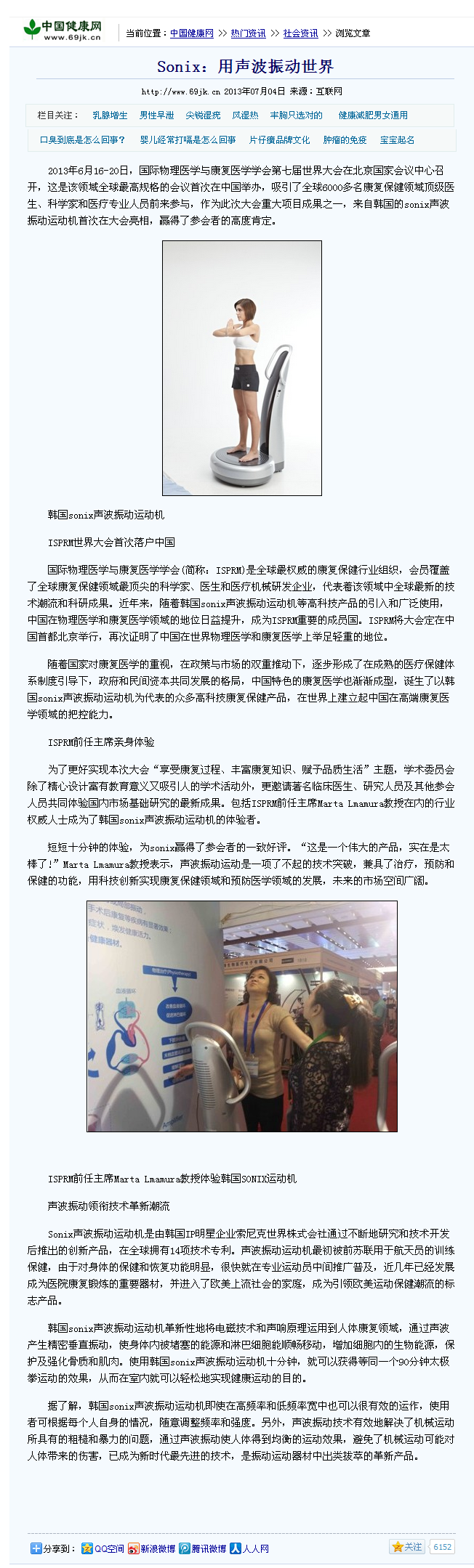 7月4日,我公司代理的韩国 SONIC WORLD Co., Ltd.产品—SONIX声波振动运动机,被三十多家媒体共同报道:“SONIX用声波振动世界”。