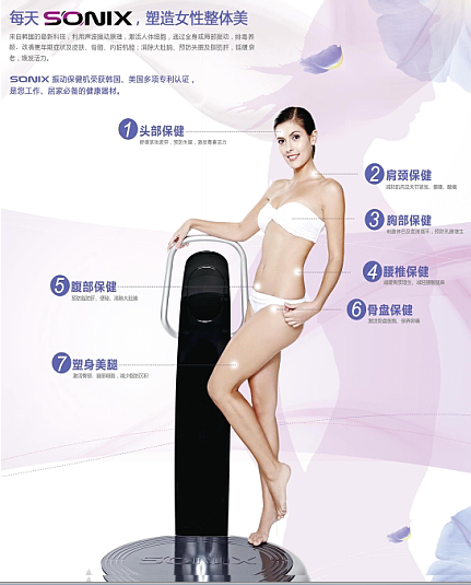 SONIX声波振动运动机是来自韩国的最新科技,它是利用声波振动刺激肌肉运动和调动全身经络系统达到促进血液、淋巴循环、促进能量代谢,舒经活络,进而调节内分泌和内脏功能的保健功效。通过全身或局部的振动,减少脂肪沉积;消除大肚腩、预防失眠及脂肪肝,延缓衰老,焕发活力。是集美容和保健功能于一体的多功能多效应健康装备。可在工作场所和居家使用,方便简洁,是现代人科学减肥和健康生活的必备选择。