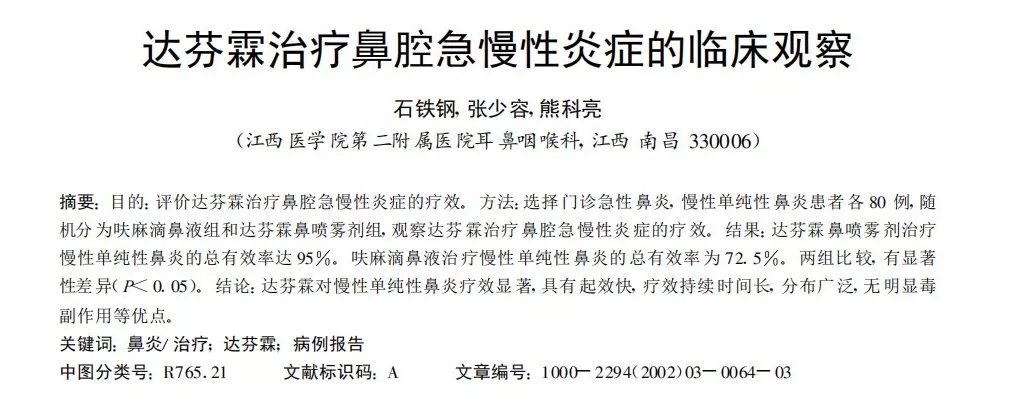 达芬霖对慢性单纯性鼻炎疗效显著, 具有起效快, 疗效持续时间长, 分布广泛, 无明显毒副作用等优点。